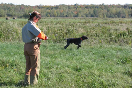 But : Arrêter les oiseaux à la vue et à l’odeur. Immobilisation à l’envol et au coup de feu. Rapporter dans la main du maître dès la chute de l’oiseau, ce qui respecte l’évaluation au champ de l’organisme NAVHDA (North American Versatile Hunting Dog Association) en classe Utility Test ou en classe chien de chasse (Field Dog) du club canin canadien.